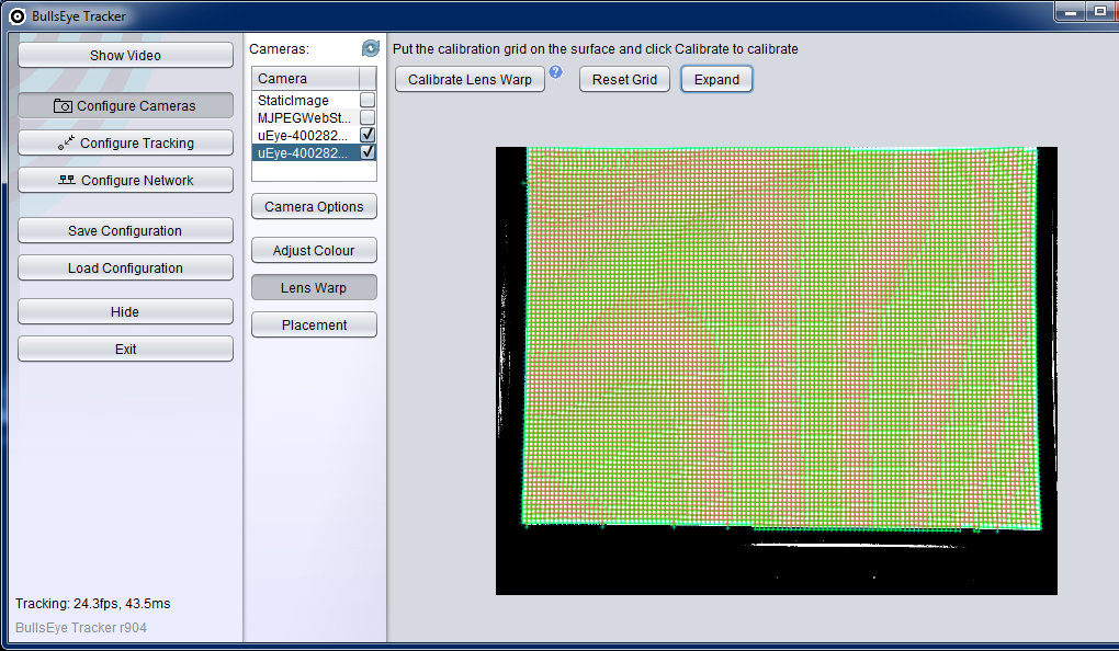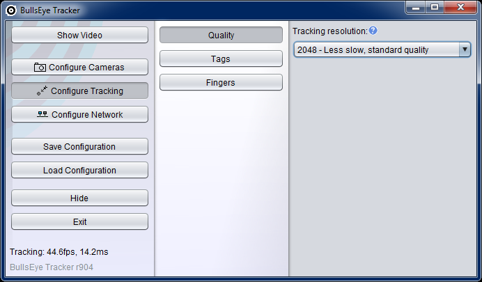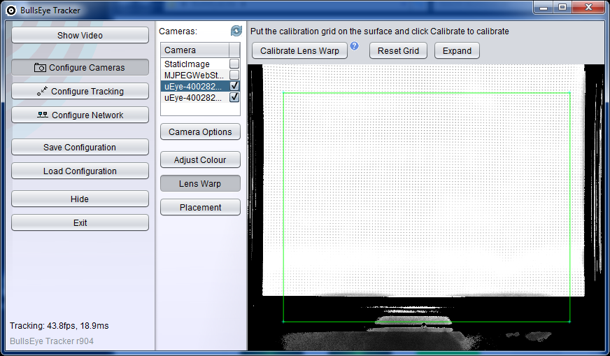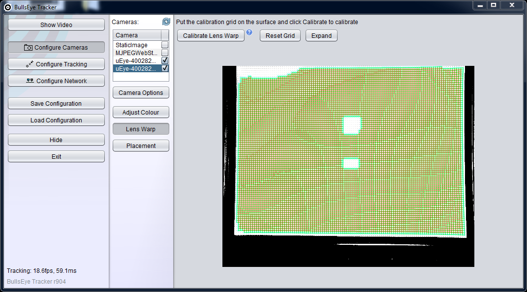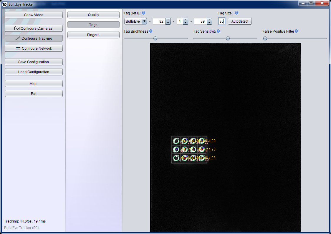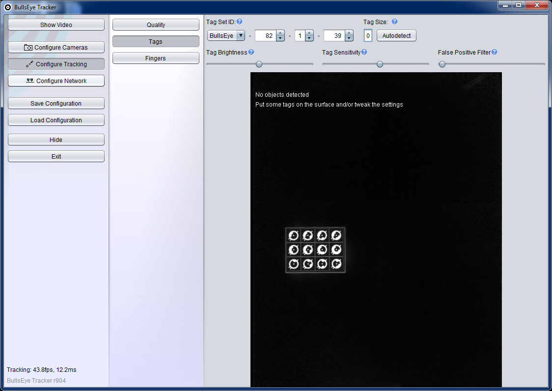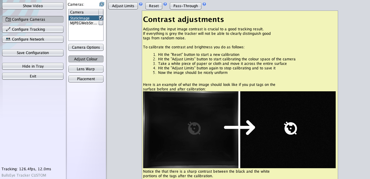 BullsEye requires a calibration of light, of camera distortion compensation and of the fiducial and finger tracking which is detailed below. BullsEye also contains embedded documentation available as tooltips on questionmarks in the UI.